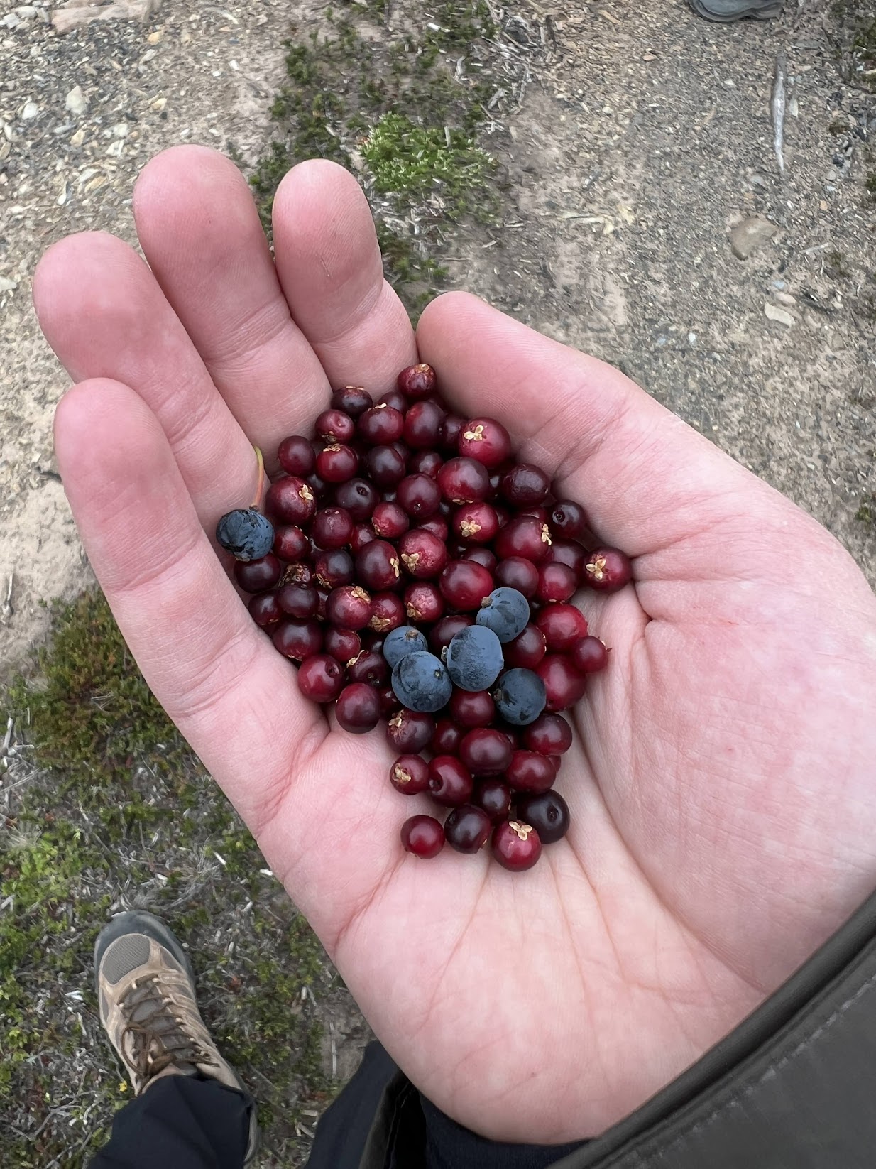Along the hike, we found plenty of edible berries that I snacked on the entire time. In this region, there are four berry species that are tasty. In the picture, the small red berries are Murtilla (empetrum rubrum). They are quite tart with a mild flavor. The larger blue ones are Calafate berries (Berberis microphylla). Those are my favorite! The two not pictured are Chaura (Gaultheria mucronata), a berry that turns white when it is ripe - it tastes like an apple. The last is the rarest; They are technically strawberries, but look more like a raspberry. They might be called the Falkland Strawberry, but the scientific name is Rubus geoides. They are by far the most delicious fruit I have ever had, and I wish I could cultivate them back home!