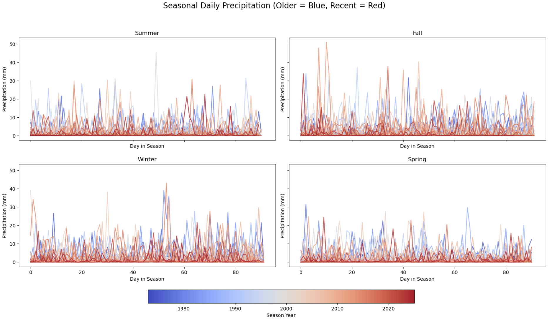 We approached our analysis of extreme precipitation in Punta Arenas by applying Extreme Value Theory (EVT), specifically the Generalized Extreme Value (GEV) distribution. In practical terms, this means zooming in on the single highest daily rainfall measurement for each season and seeing how well it fit the curve. Doing so helped us judge the likelihood that rainfall in this area might have “heavy tails,” or in other words, a higher chance of truly massive rainstorms than standard precipitation models tend to predict. All seasons showed a positive shape parameter (ξ>0), suggesting that rare but extremely intense storms are very much on the table.